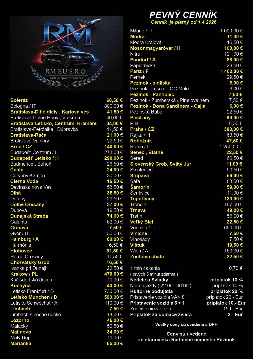 Spoločnosť RM Taxi je vašim partnerom pre prémiovú osobnú dopravu. Od roku 2000 prinášame klientom v Pezinku a okolí špičkovú kvalitu, diskrétnosť a maximálnu spoľahlivosť. Či už potrebujete rýchly presun po meste, non-stop odvoz na letisko (Bratislava, Viedeň, Budapešť) alebo medzinárodnú prepravu kamkoľvek v rámci EÚ, náš moderný vozový park a profesionálni vodiči sú vám k dispozícii 24 hodín denne, 7 dní v týždni.